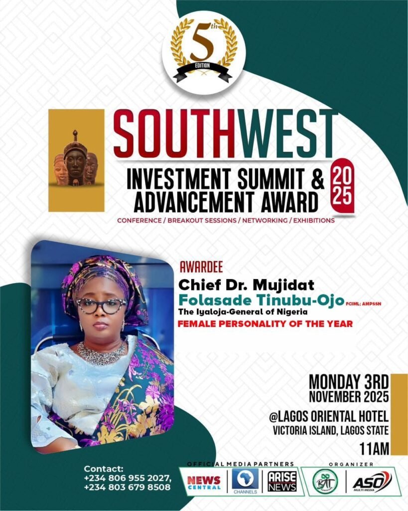 The Organizing Committee of the 5th Southwest Investment Summit & Advancement Award 2025, proudly organized by ASO Multi Media, is delighted to announce that Chief (Dr.) Folasade Tinubu-Ojo, the Iyaloja-General of Nigeria, will be honoured as the Female Personality of the Year at this year’s prestigious event.