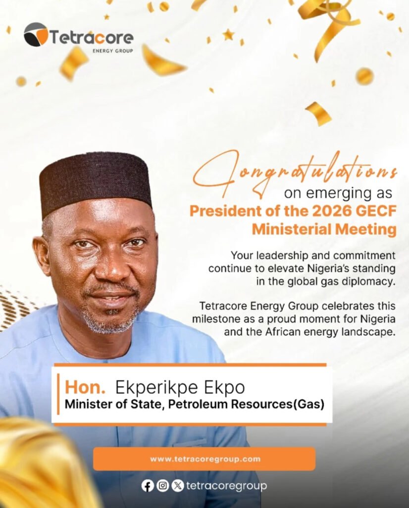 Olakunle Williams CEO of Tetracore Energy Group congratulations to Hon. (Obongemem) Ekperikpe Ekpo, Minister of State for Petroleum Resources (Gas), on emerging as the President of the 2026 GECF